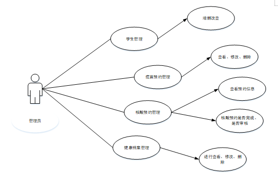 (3)管理员模块中的用户角色是管理员,管理员通过系统对可以实现网站系统管理,个人中心、班级管理、学生管理、健康信息管理、请假信息管理、核酸预约管理、疫苗预约管理、核酸结果管理、信息提醒管理、健康档案管理、系统管理。管理员模块用例图如图3-3所示。