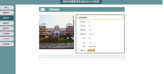 学生在请假信息页面可以查看请假标题、是否出校、离开本地、请假图片、请假原因、请假文件、请假日期、学号、姓名、手机等信息,并可以根据需要进行点击下载操作。程序效果图如下图5-14所示: