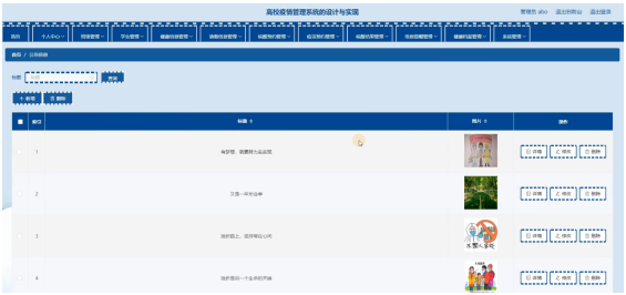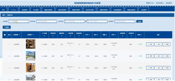 管理员在健康信息管理列表可以查看上报标题、上报图片、个人体温、身体状况、风险地区、上报日期、疫苗接种、学号、姓名、班级、手机、审核回复、审核状态、审核等信息,并可以进行审核、删除、修改操作。程序效果图如下图5-4所示:
