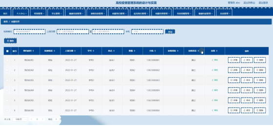 管理员在核酸预约管理列表可以查看预约标题、预约图片、预约时间、预约内容、预约备注、上报日期、学号、姓名、班级、手机、审核回复、审核状态、审核等信息,进行审核、删除、修改操作。程序效果图如下图5-5所示: