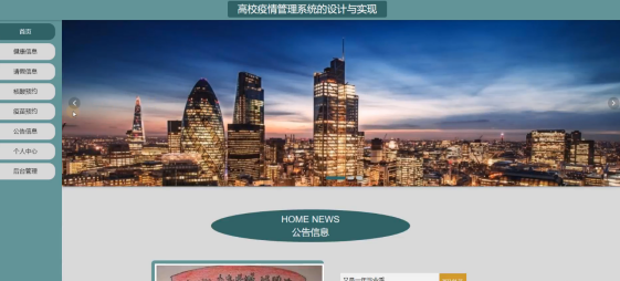 学生登录进入高校疫情管理系统页面可以查看首页、健康信息、请假信息、核酸预约、疫苗预约、公告信息、个人中心、后台管理等功能。程序效果图如下图5-12所示: