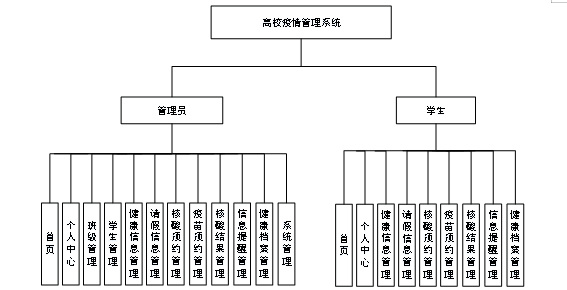 本系统的需求分析旨在通过对高校疫情管理系统的详细调查,经过认真的分析研究之后,得出学生和管理员在高校疫情管理整个活动间各种需求,相应的得出各个功能模块的在整个系统的运行过程中需要建立和处理的相关数据,进一步分析系统需要完成的各项数据处理功能。这一步骤乃是整个系统的基础,必将直观深刻地对整个系统的下一阶段的设计实现产生影响,进而关系到系统最终成果的可行性和实用性。
