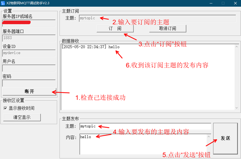 在本地电脑启动“MQTT客户端调试工具”软件,在主界面输入服务器外网地址、端口、设备ID,点击“连接”按钮,如下图
