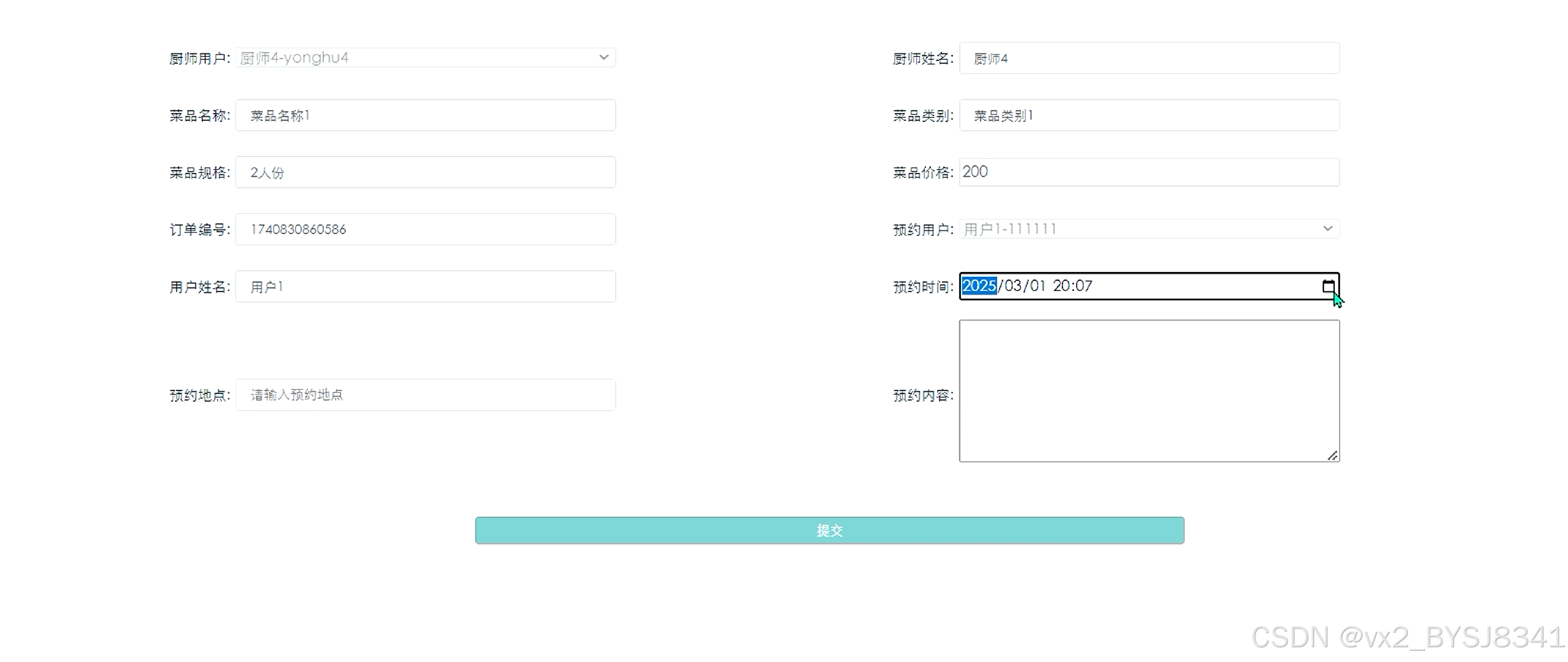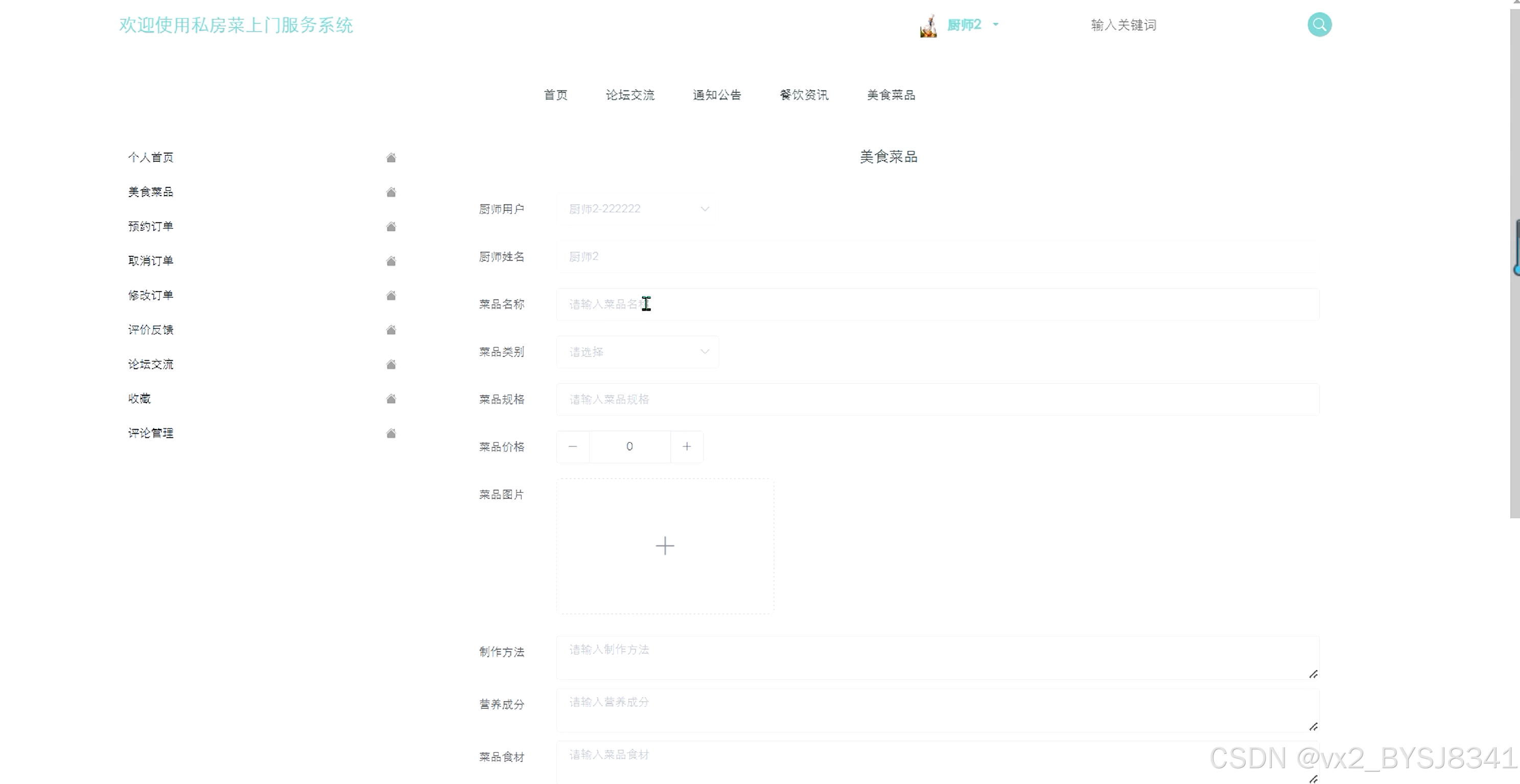 个人中心为厨师用户提供了一系列功能模块以优化其工作流程和管理体验。通过个人首页,厨师可以访问并管理美食菜品、预约订单、取消订单、修改订单及评价反馈等功能。在美食菜品模块中,厨师能够添加详细的菜品信息,包括菜品名称、类型、规格、价格、图片、制作方法、营养成分等。预约订单模块允许厨师查看用户的预约列表,并对这些预约进行审核回复;同样地,取消订单和修改订单模块也让厨师能够查看相关请求列表并对用户的取消或修改操作进行审核回复。此外,厨师还可以通过评价反馈模块查看用户对其菜品或服务的评价与反馈。界面如下图所示。