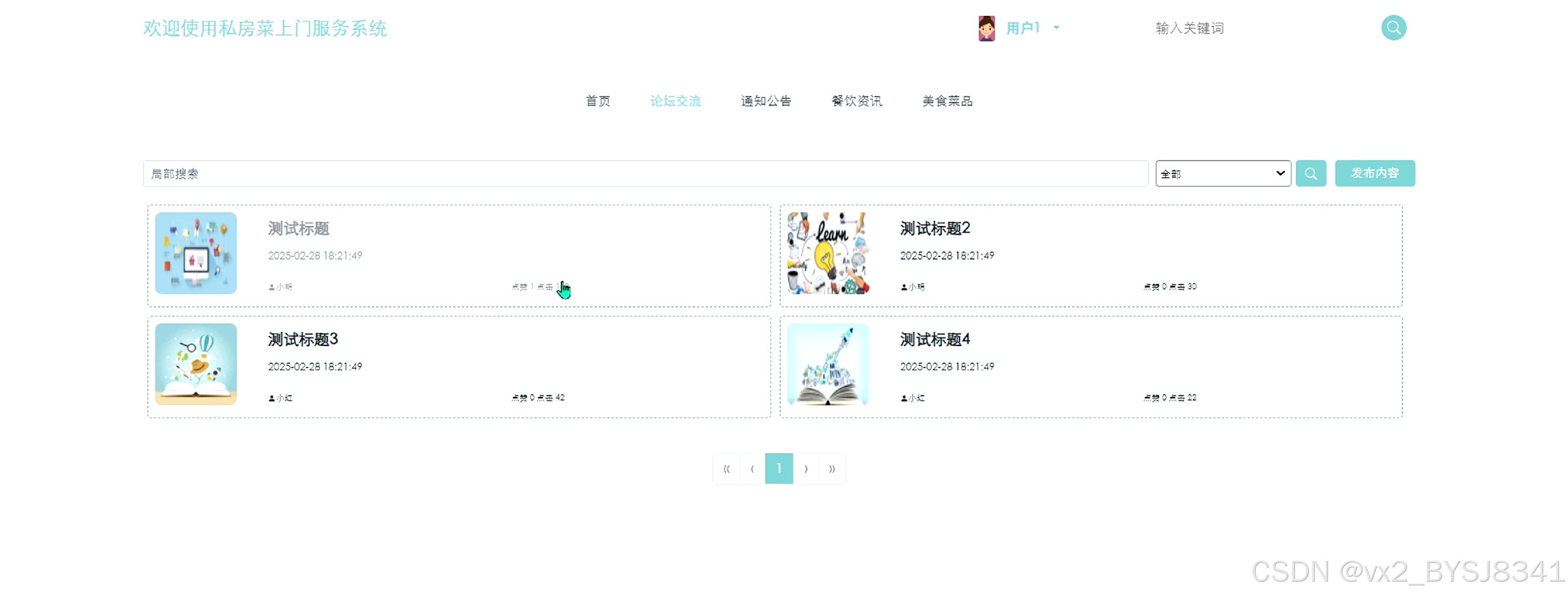 (2)首页:用户进入私房菜上门服务系统的时候,首先映入眼帘的是系统的首页、论坛交流、通知公告、餐饮资讯、美食菜品等信息。