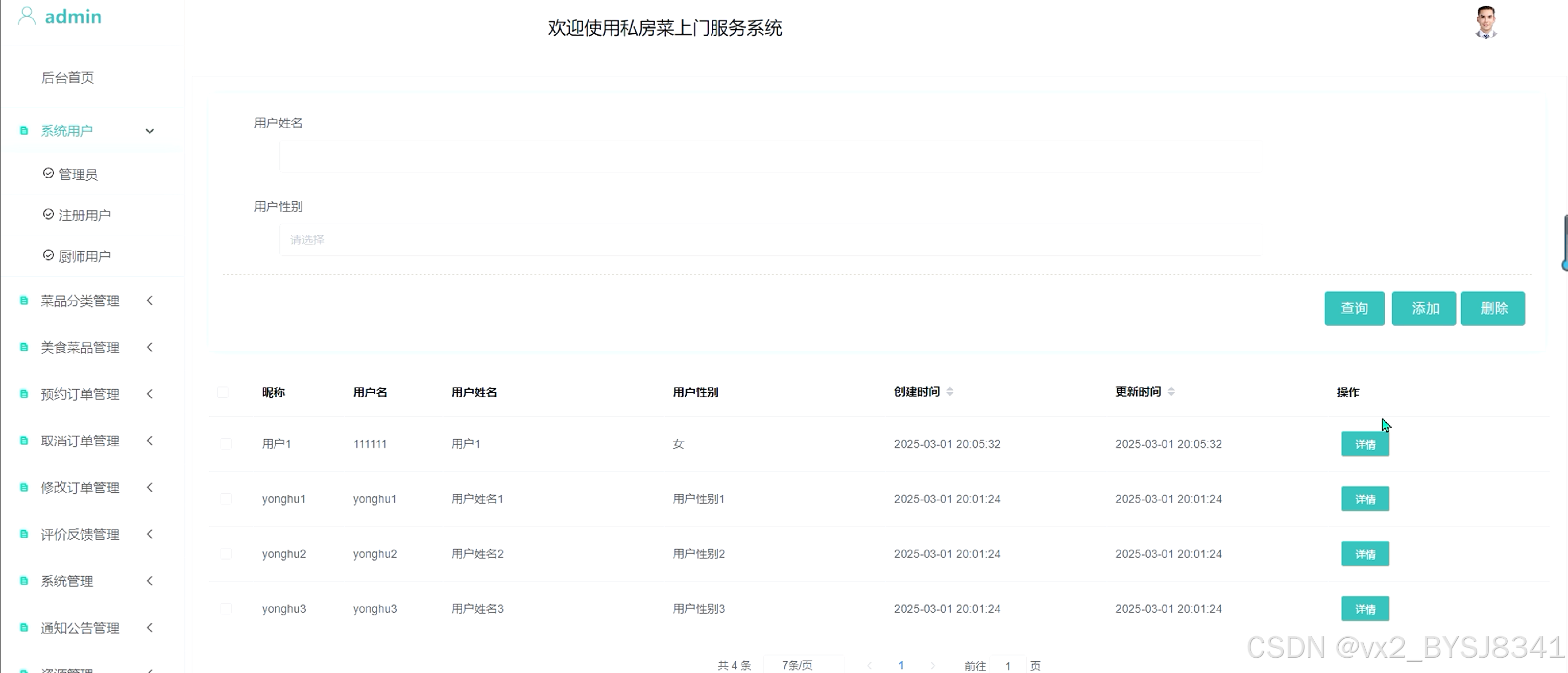 系统用户:管理员点击可查看系统用户(管理员、注册用户、厨师用户)列表中某个用户的详情,可以对用户信息进行查询、审核、添加和删除操作。界面下图所示。