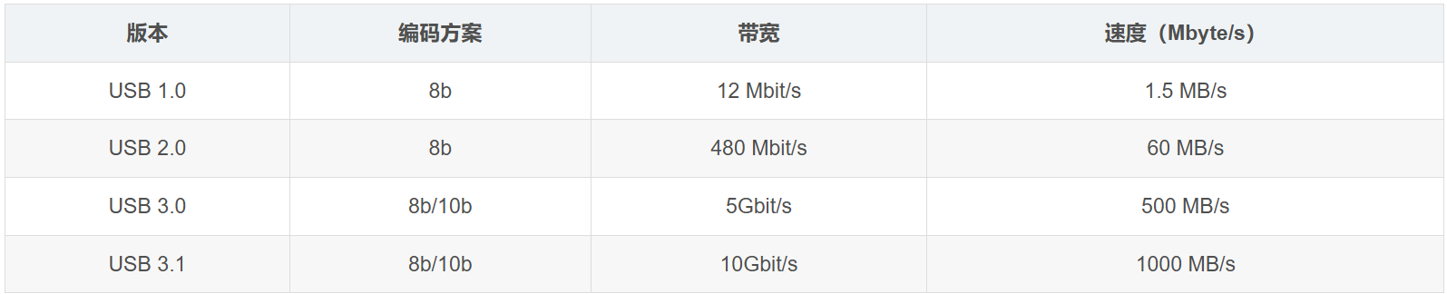 注2:USB3.0和 3.1带宽并不是5Gb/s除以8得到的625MB/s,而是采用与SATA相同的10Bit传输模式(在USB2.0的基础上新增了一对纠错码),因此其全速只有500MB/s。