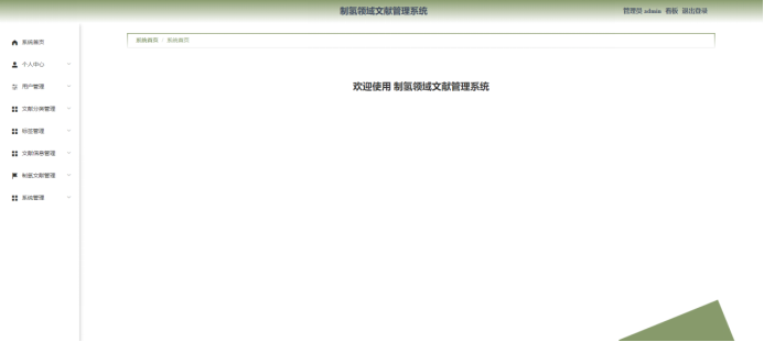管理员进入主页面,主要功能包括对个人中心、用户管理、文献分类管理、标签管理、文献信息管理、制氢文献管理、系统管理等进行操作。管理员主页面如图5-6所示: