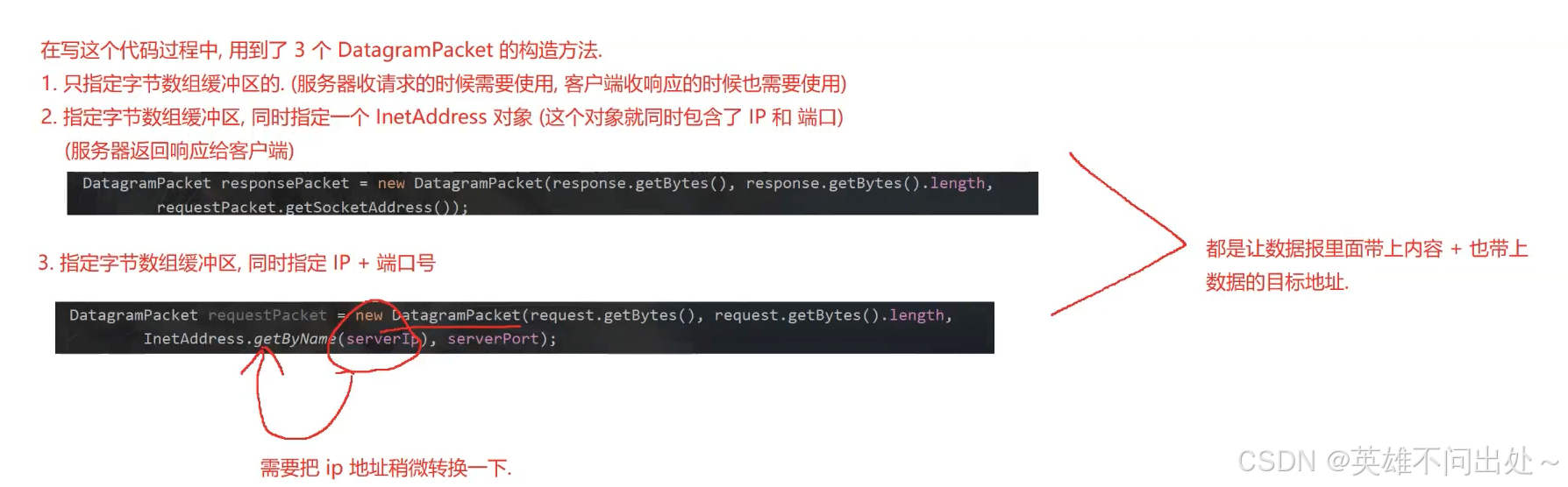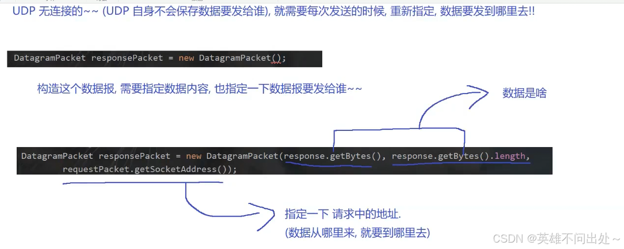 4. 把响应写回客户端,搞一个响应对象 DatagramPacket,往 DatagramPacket 里构造刚才的数据,再通过send返回