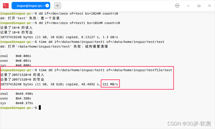 2、使用time dd命令进行文件拷贝速度和时间测试:time dd if=/data/home/inspur/test1 of=/data/home/inspur/testfile/test