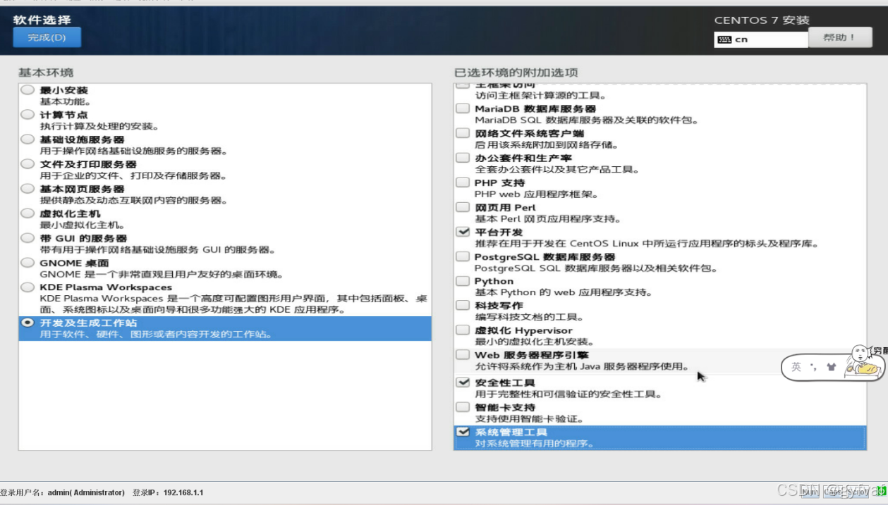 环境的附加选项->“附加开发、兼容性程序库、开发工具、电子邮件服务器、Emacs、FTP服务器、文件及存储服务器、硬件监控工具、KDE、大系统性能、传统X Windows系统的兼容性、平台开发、安全性工具、系统管理工具”