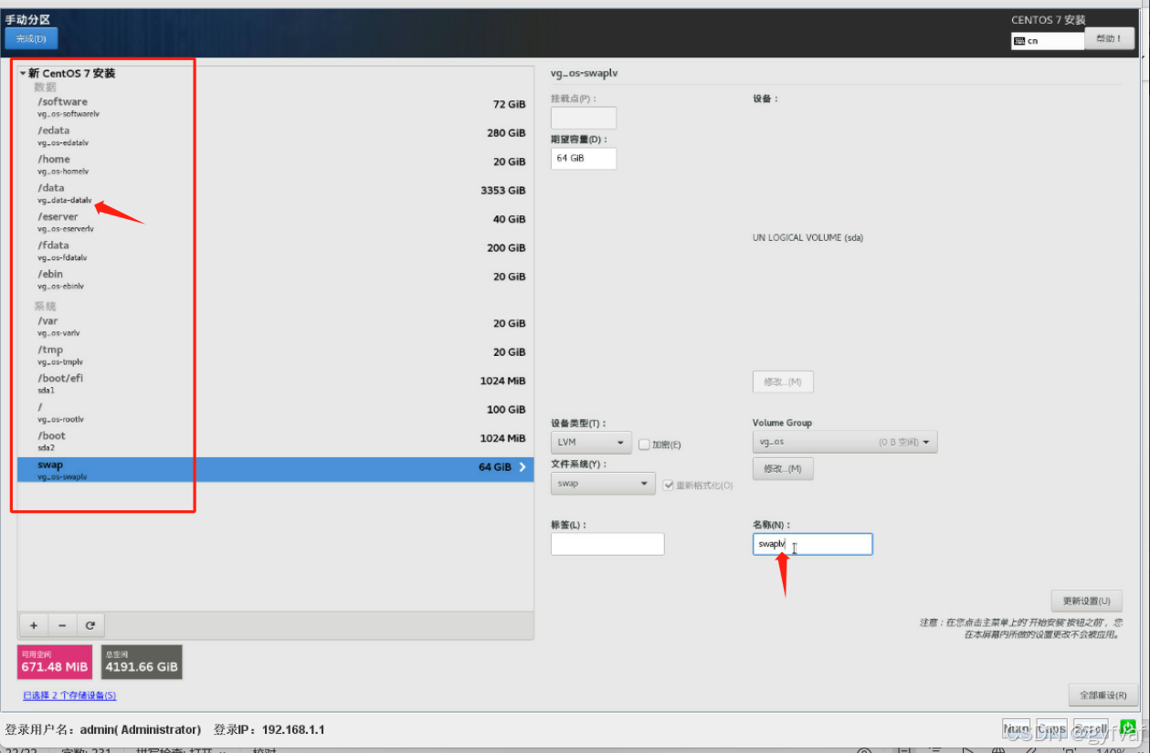 3.1.9、修改名称,在名称后面加lv,只有swap、boot和boot/efi不用修改(这是用户要求)