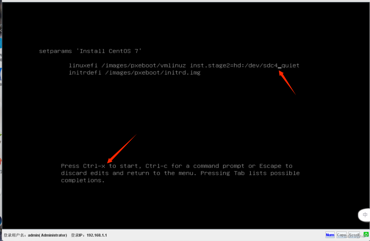 2.4、将路径进行修改,修改inst.stage2=hd:xxx quiet之间的内容,按Ctrl+x启动安装(sdc4是确定后的U盘分区)