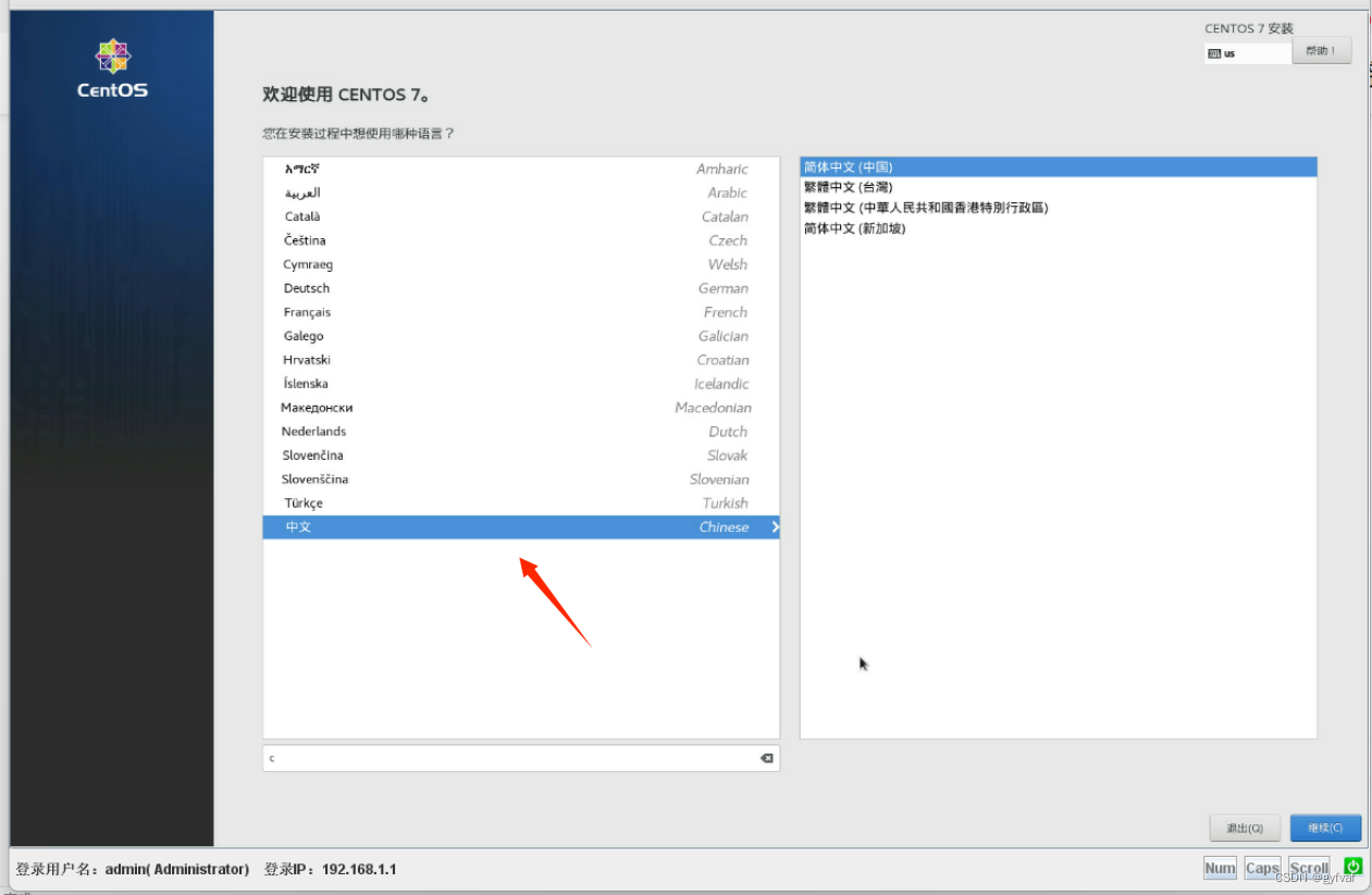 3、安装Centos7.9(安装过程中使用中文安装,点击继续)