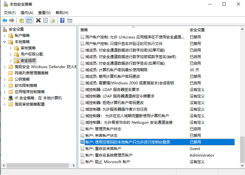 在本地安全策略下面的路径,将帐户:使用空密码的本地帐户只允许进行控制台登录的策略禁用即可。