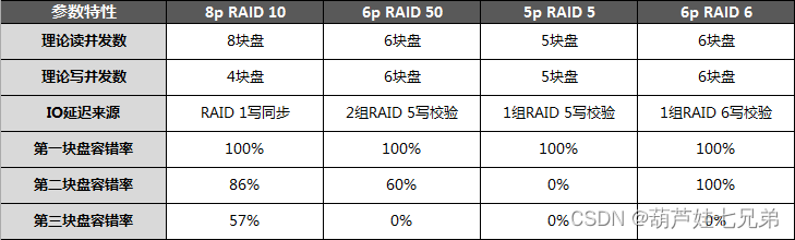 容错方面,R50接近R10:第二块盘容错率R50十分接近R10,两者相差30%。R10的优势主要是在有一定的概率提供第三、甚至第四块磁盘的容错率,但是考虑到并非100%容错,因此从容错角度来看R50虽然和R10有一些差距,但也已体现出较好的容错率,至少优于R5。而且R50搭配灵活,甚至可以指定3组R5以达到最大3块磁盘的容错;