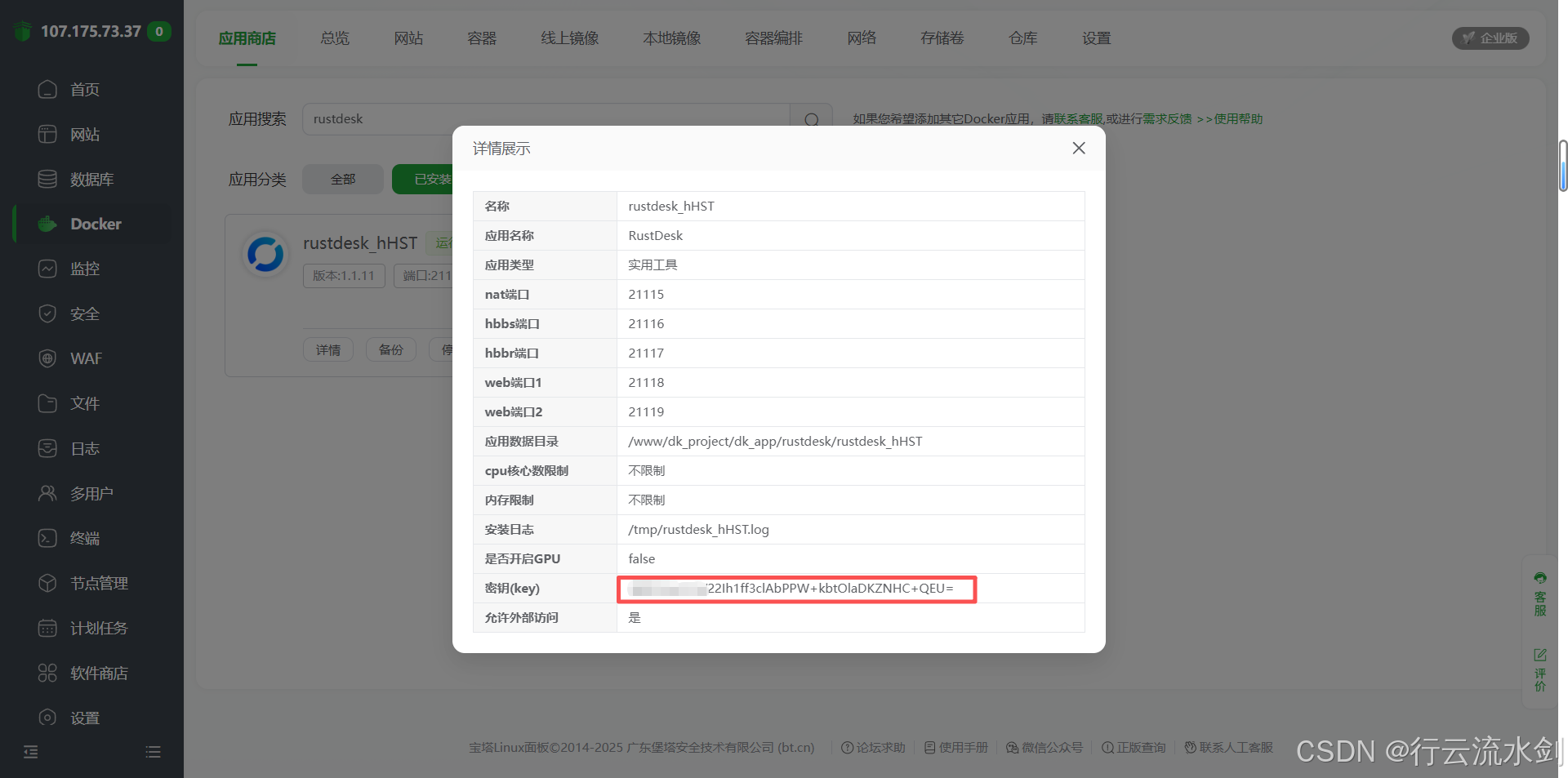 通过 宝塔面板 + Docker 的组合,我们实现了 RustDesk 服务端的零命令、可视化部署,整个过程简单高效,非常适合个人用户、开发者或小型团队搭建私有化远程控制方案。