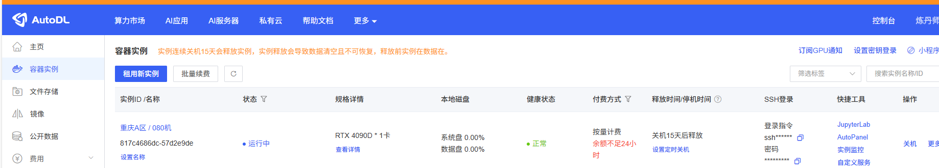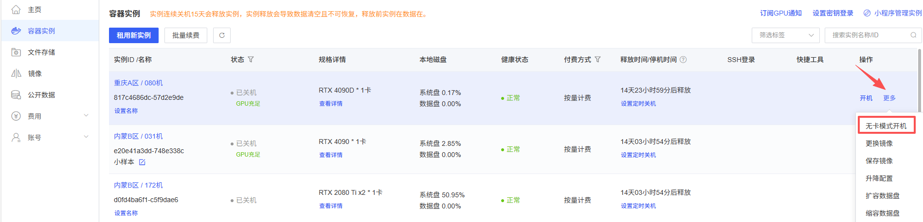 配置完之后会自动跳转到控制台容器实例界面,建议首次学习配置的时候在租用好服务器之后,关机,然后选择“无卡开机”的模式进行配置。