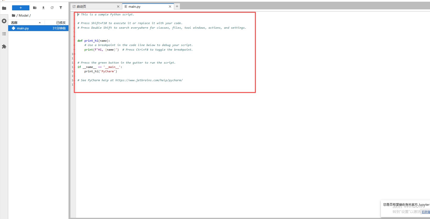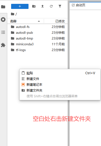 回到我们的服务器中,进入JupterLab,点击空白区创建文件夹方便后续文件管理,可以不用和你项目所在文件夹同名,比如我在服务器上是Model,但是本地是Test文件夹。