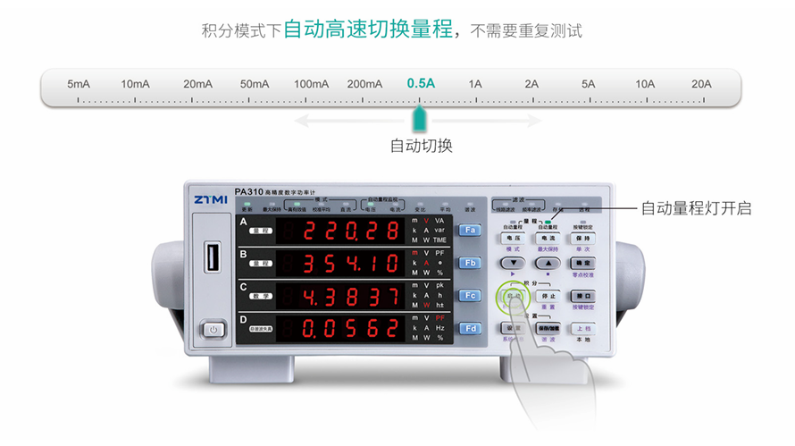高速自动量程:在负载动态变化的测试过程中,PA310的积分模式可以实现高速、无缝的量程切换,确保采集到的功率数据是连续、完整的。