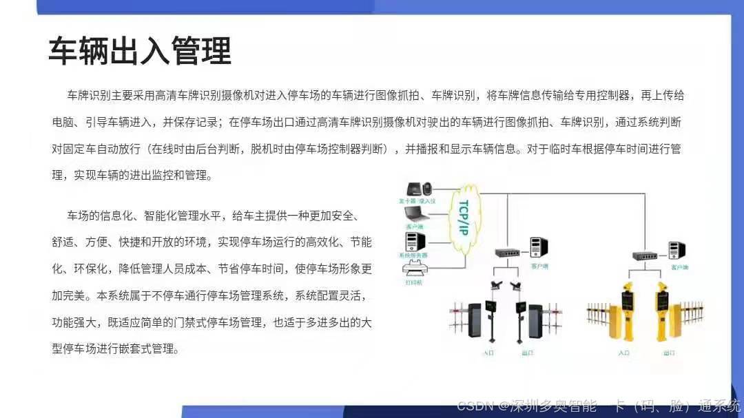车辆出入口管理。实现车辆自动识别、计费、放行,支持无感支付。