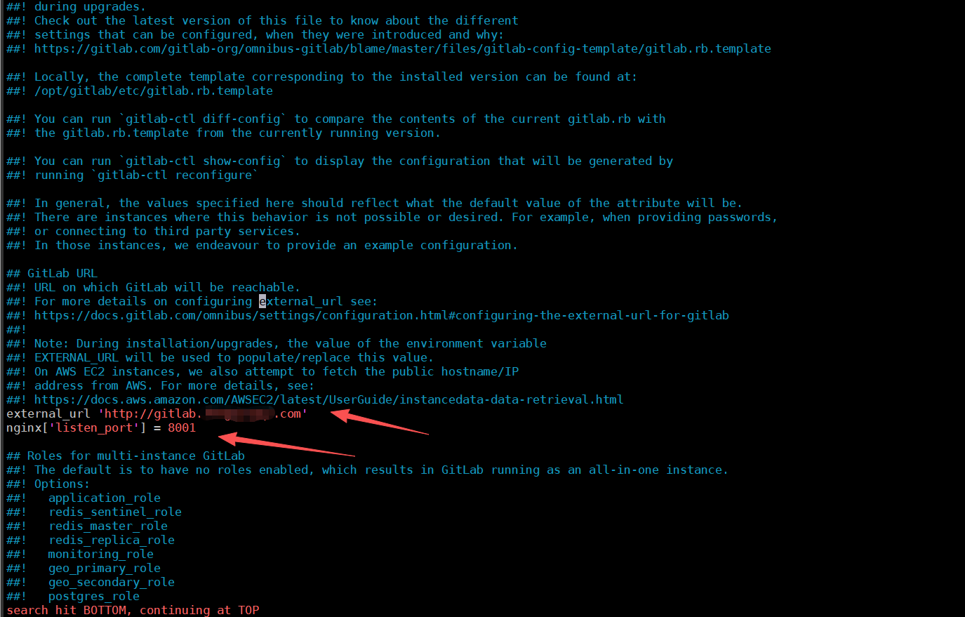 2)如下图,将注释掉的# external_url ‘http://gitlab.example.com’,修改为服务器ip或域名,并添加一行设置未占用并开放的端口,修改完成后保存退出。