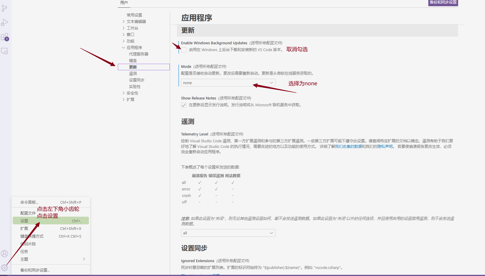 1、关闭当前VsCode的自动更新,防止后续出现同样的问题;