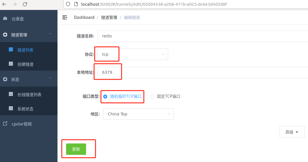 - 隧道名称:可自定义,注意不要与已有的隧道名称重复,本例使用了:redis