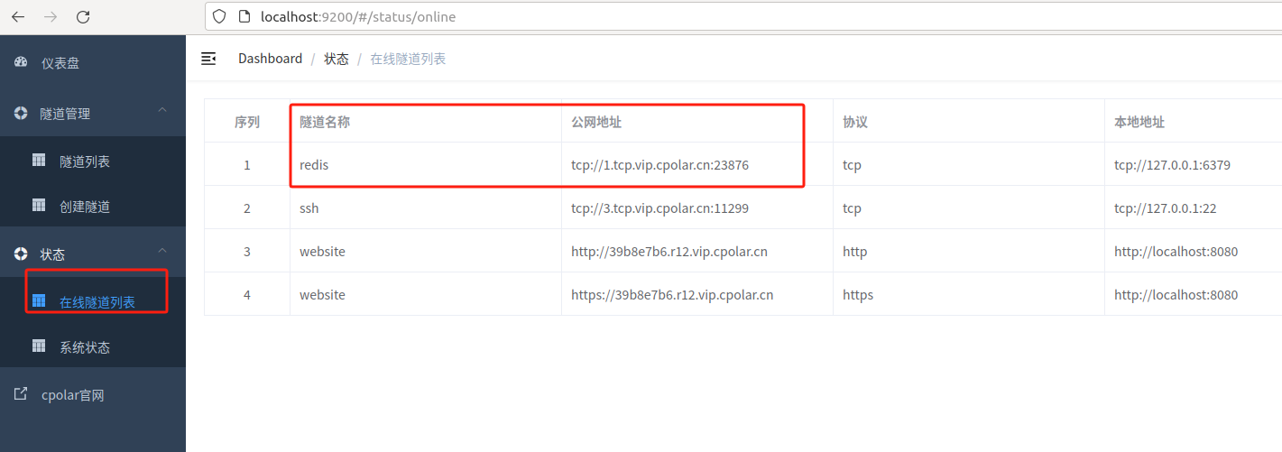 创建成功后,打开左侧在线隧道列表,可以看到刚刚通过创建隧道生成了公网地址,接下来就可以在其他电脑(异地)上,将该地址与端口号分别复制到Redis Desktop Manager访问即可。