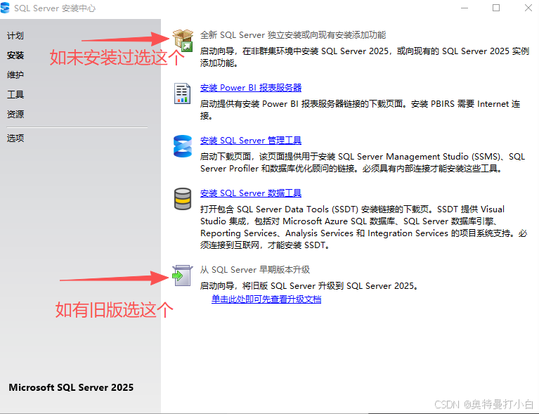 图中 SQL Server 2025 安装中心的几个选项,核心区别在于适用场景和安装目标,具体说明如下: