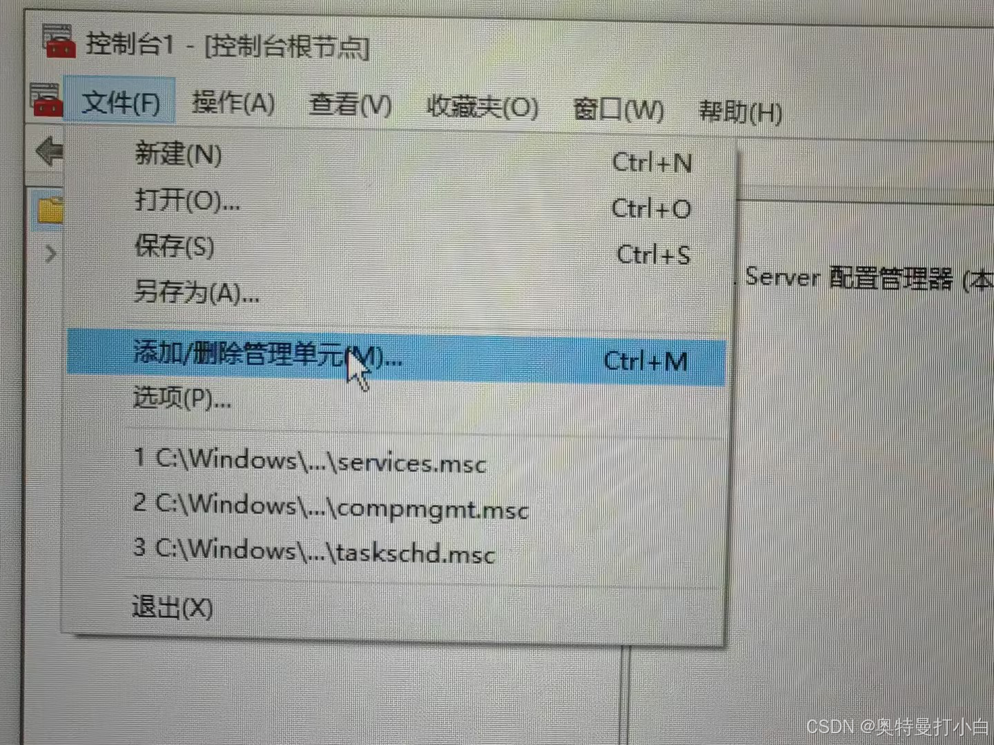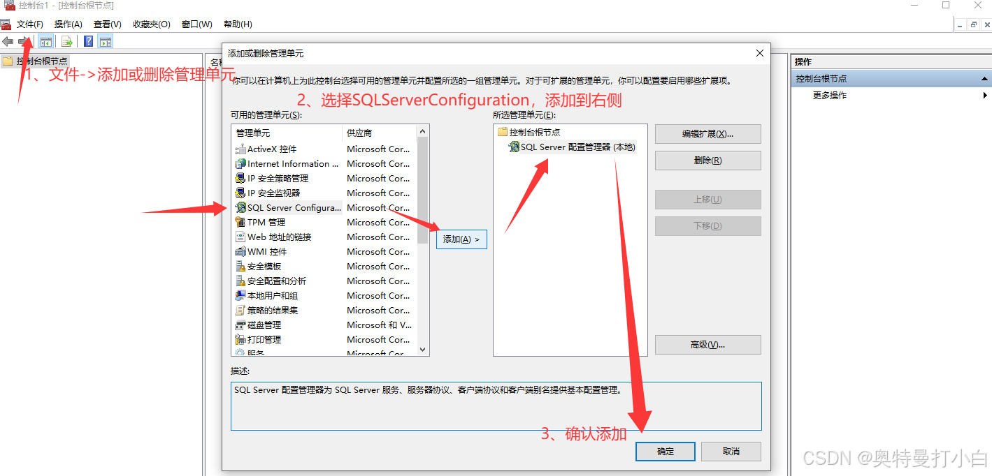 在管理控制台中,添加或删除管理单元,将SQL Server Configuration添加到控制台