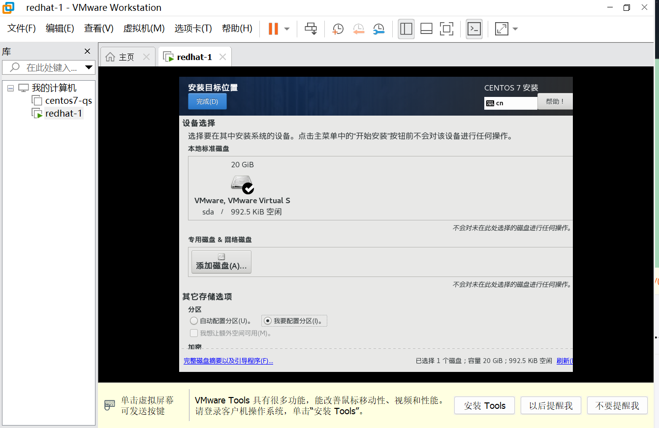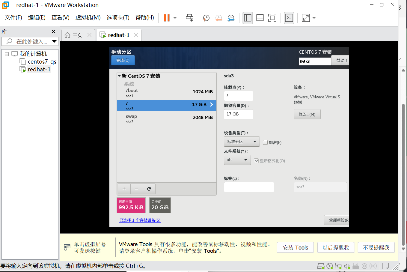 安装位置:选“我要配置分区” -> (在所弹出的页面)栏目选“标准分区” -> 点击左下角加号)设置三个分区(/boot分区、swap区、 /分区, 分别分配1G、2G、17G)