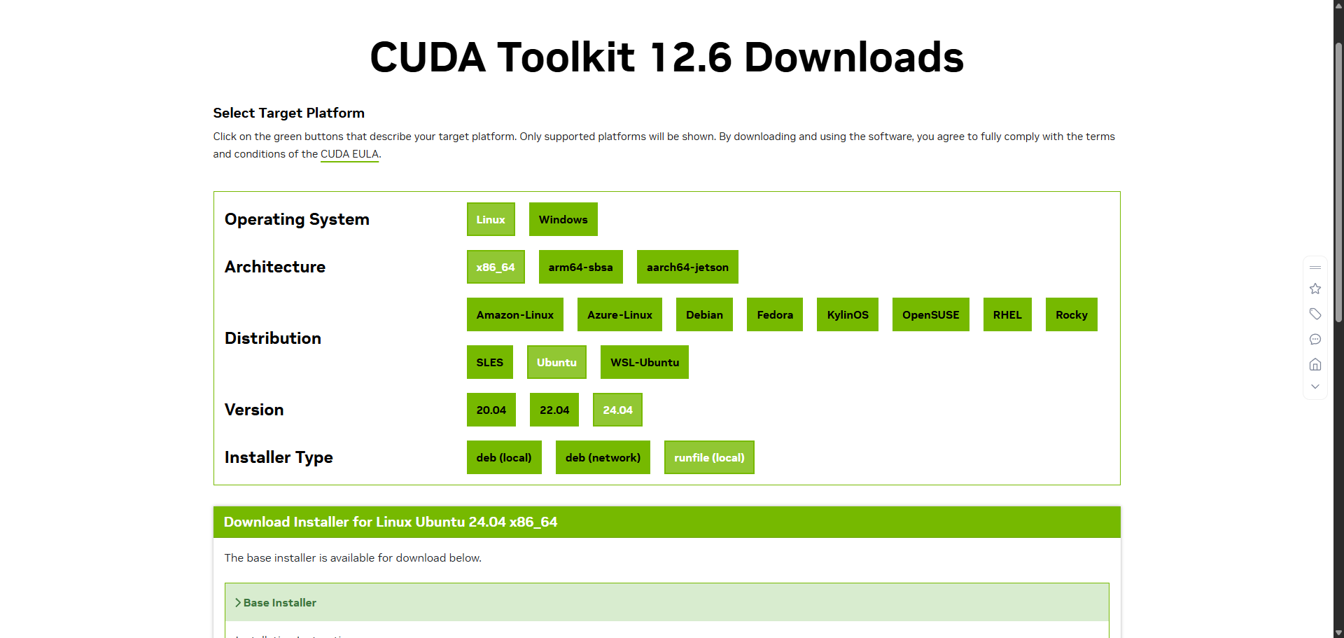 最好不要安装最新版本的,要不然后面可能会有一系列的问题出现。。。这里我安装CUDA 12.6,这个是支持Ubuntu24.04的第一个版本