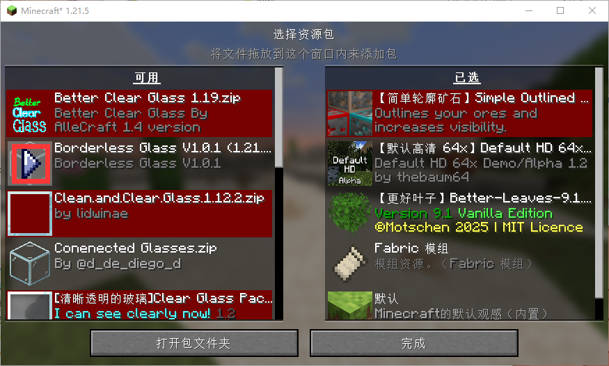 5.材质包点击资源包,在左边可用列表中找到你想启用的材质包,鼠标放到图标点击箭头移动到右侧就是启用。注意多个材质包有顺序,最上面的优先级最高,优先使用上方的材质,上方没有的材质会使用下方的材质包。