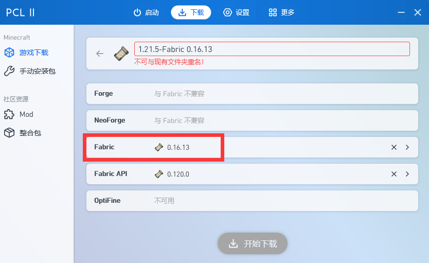 - 选择Fabric,点最新的稳定版,选择后点击开始下载