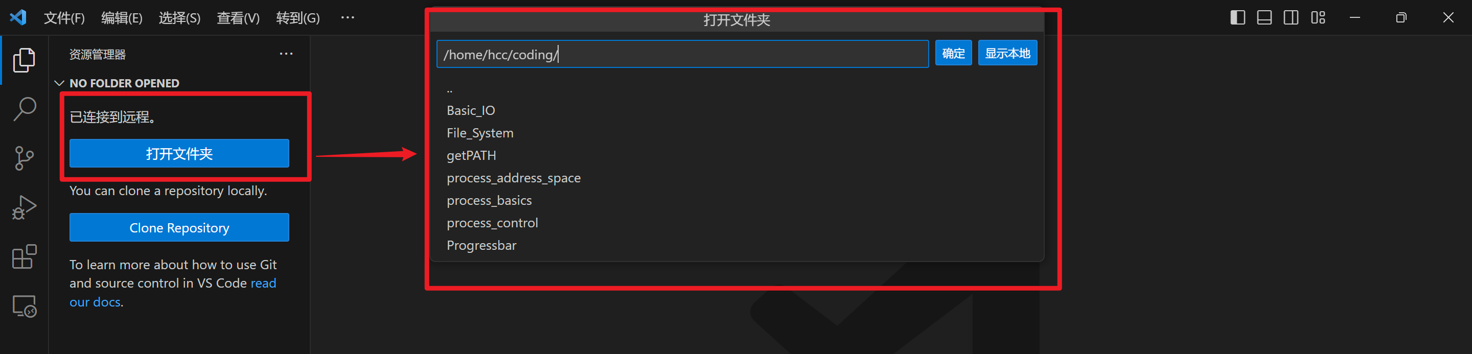 下面的操作其实和在 Xshell 中操作区别不大,优点是使用 VS Code 代替了 Vim,下面简单演示一下基本使用: