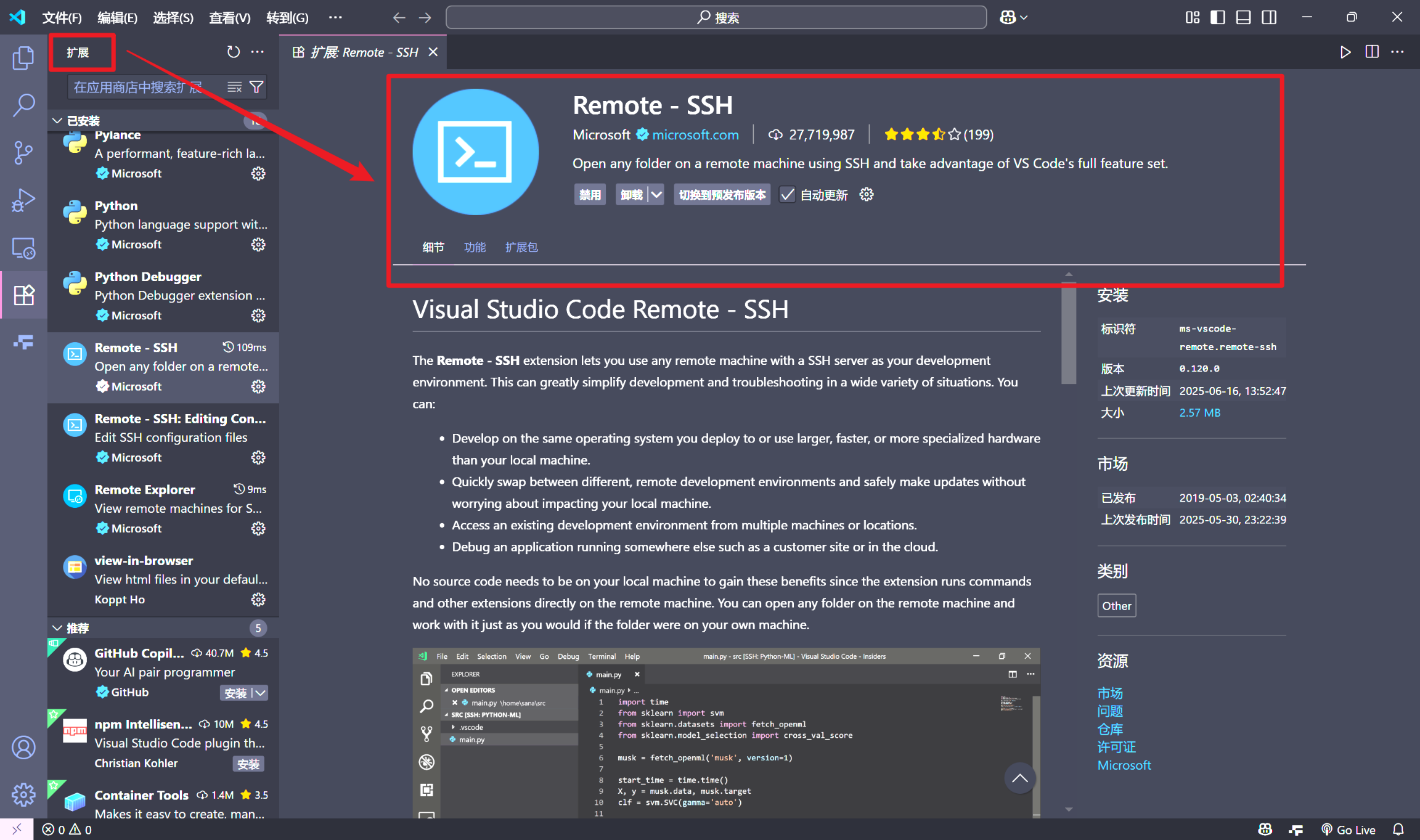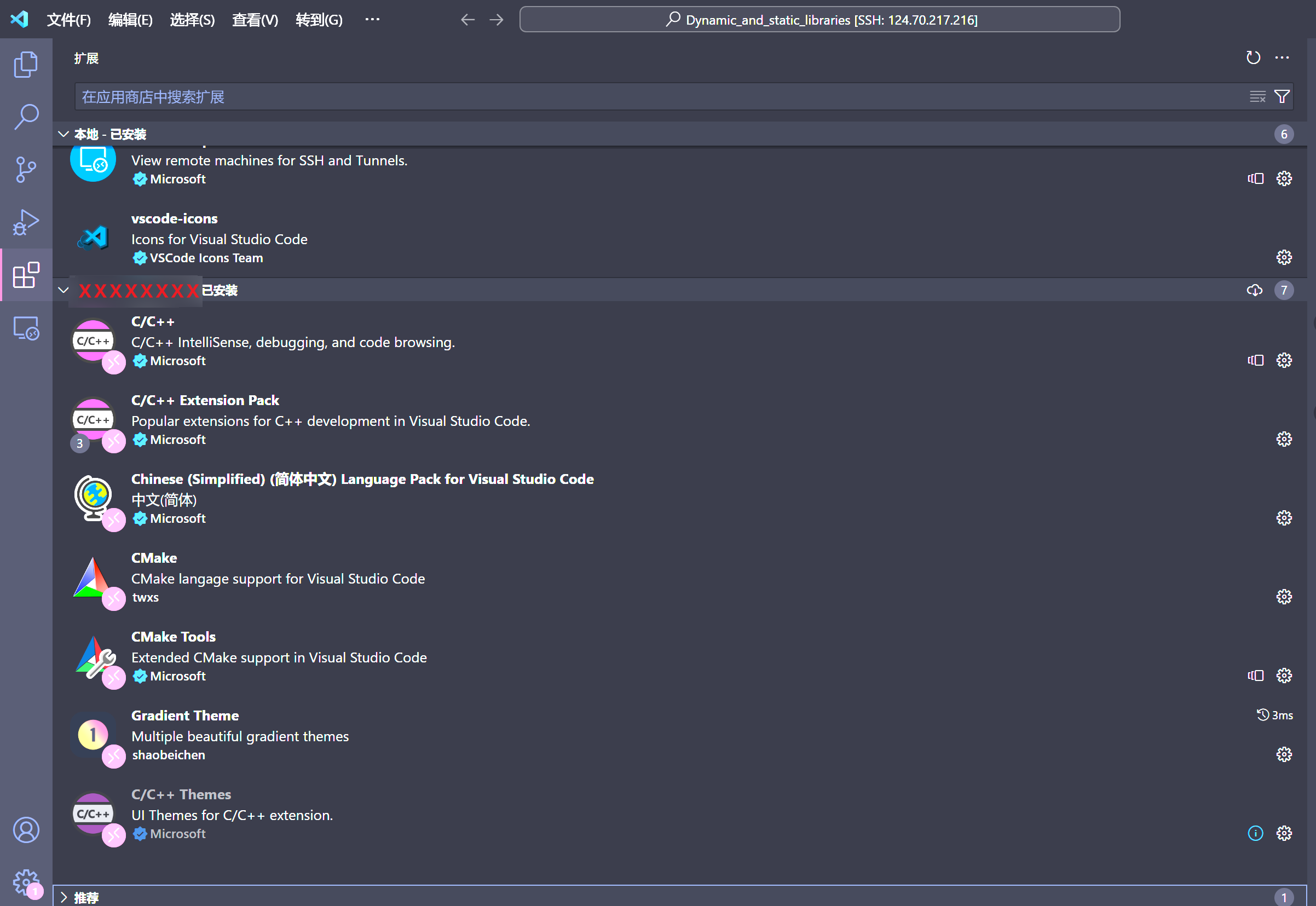 连上主机后来写代码其实是不太顺手的,所以,我们还需要装一些插件用于代码高亮、提示等。注意一定要连接上主机后再下载自己想要的插件,这样才不是装到了自己 Windows 的本地(当然极少部分插件也只能安装在本地)!下面展示我的一些基本使用的插件,算是大道至简了,更多插件请自行探索。
