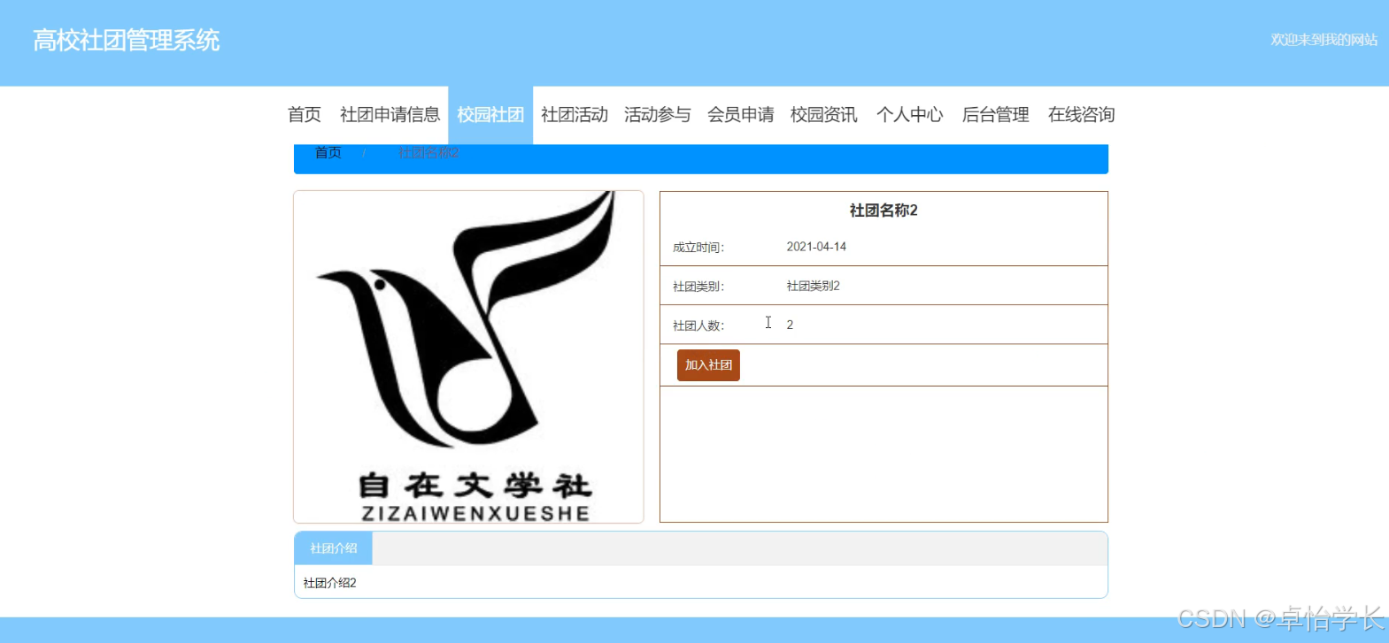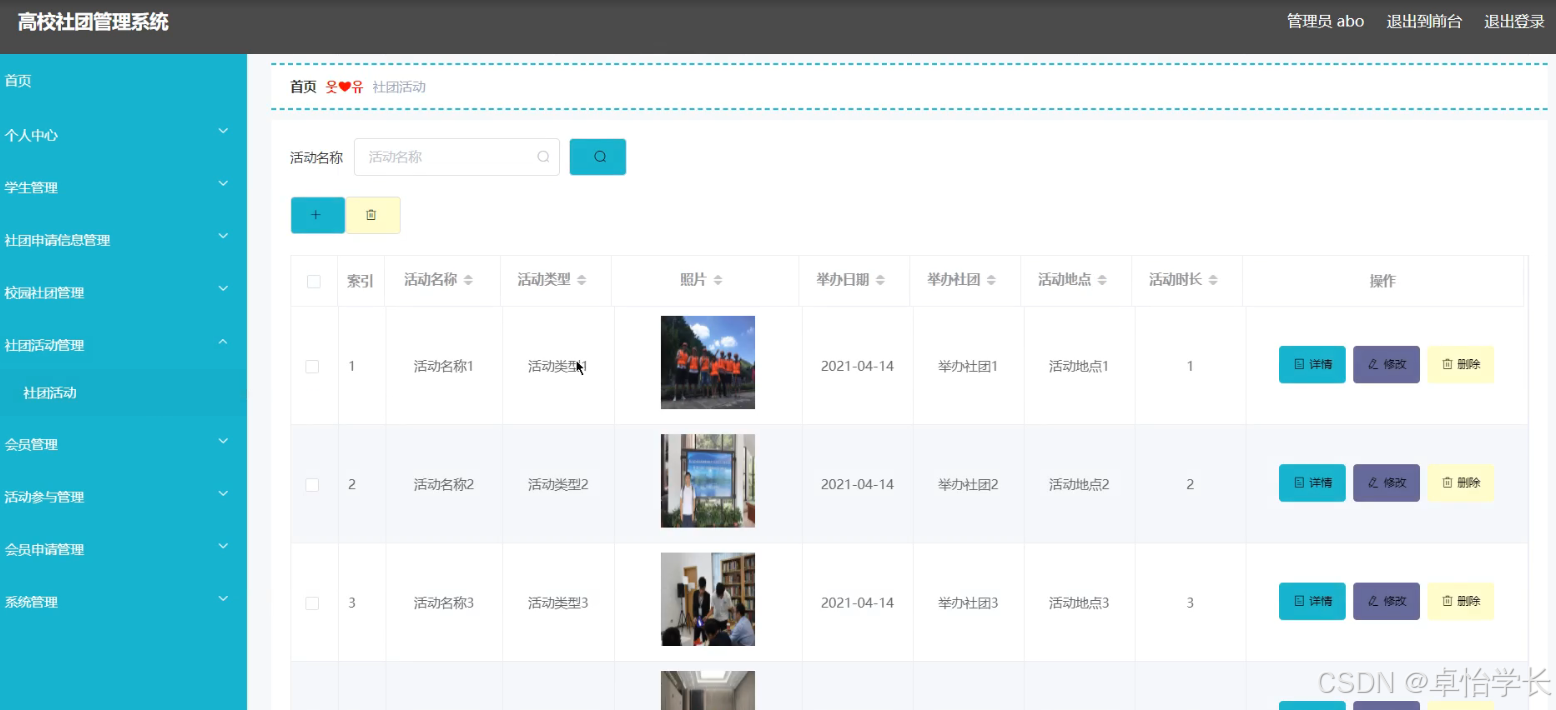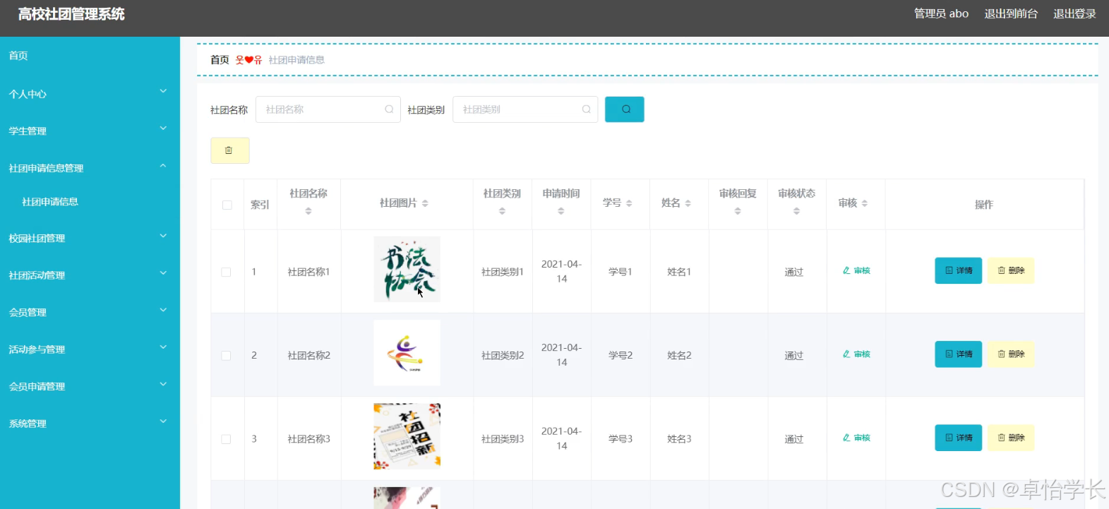 本文以Java为开发技术,实现了一个高校社团管理系统。高校社团管理系统的主要实现功能包括:管理员:首页、个人中心、学生管理、社团申请信息管理、校园社团管理、社团活动管理、会员管理、活动参与管理、会员申请管理、系统管理,会员;首页、个人中心、社团申请信息管理、校园社团管理、社团活动管理、活动参与管理,学生;首页、个人中心、校园社团管理、社团活动管理、会员申请管理,前台首页;首页、社团申请信息、校园社团、社团活动、活动参与、会员申请、校园资讯、个人中心、后台管理、在线资讯功能,基本上实现了整个高校社团管理系统的过程。