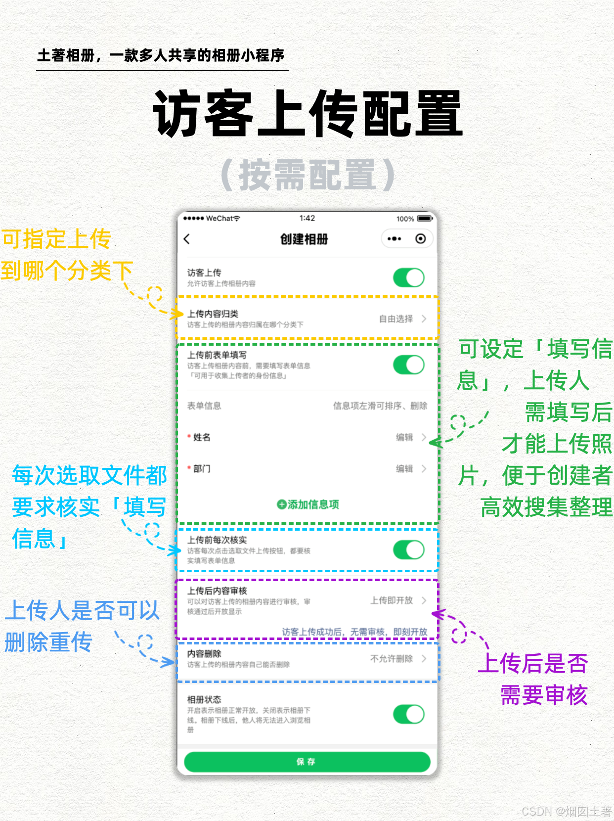 上传前表单填写:访客上传相册内容前,需要填写表单信息「可用于收集上传者的身份信息」