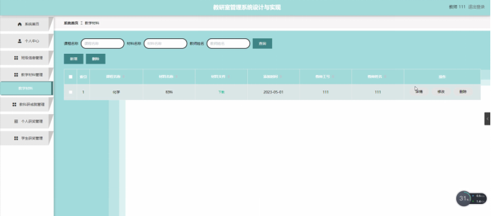 教师点击教学材料管理。在教学材料页面输入课程名称、材料名称和教师姓名进行查询、新增和删除教学材料列表,并根据需要对教学材料详情信息进行详情、修改或删除操作;如图5-11所示: