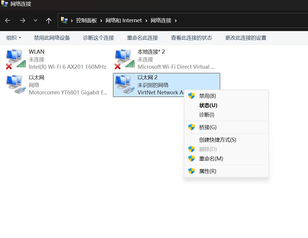 2.右键单击虚拟网卡,我这里是virNet Network ,禁用,然后再重新启用。等到他连接完成。我再运行sw2025就注册成功,并正常打开了。