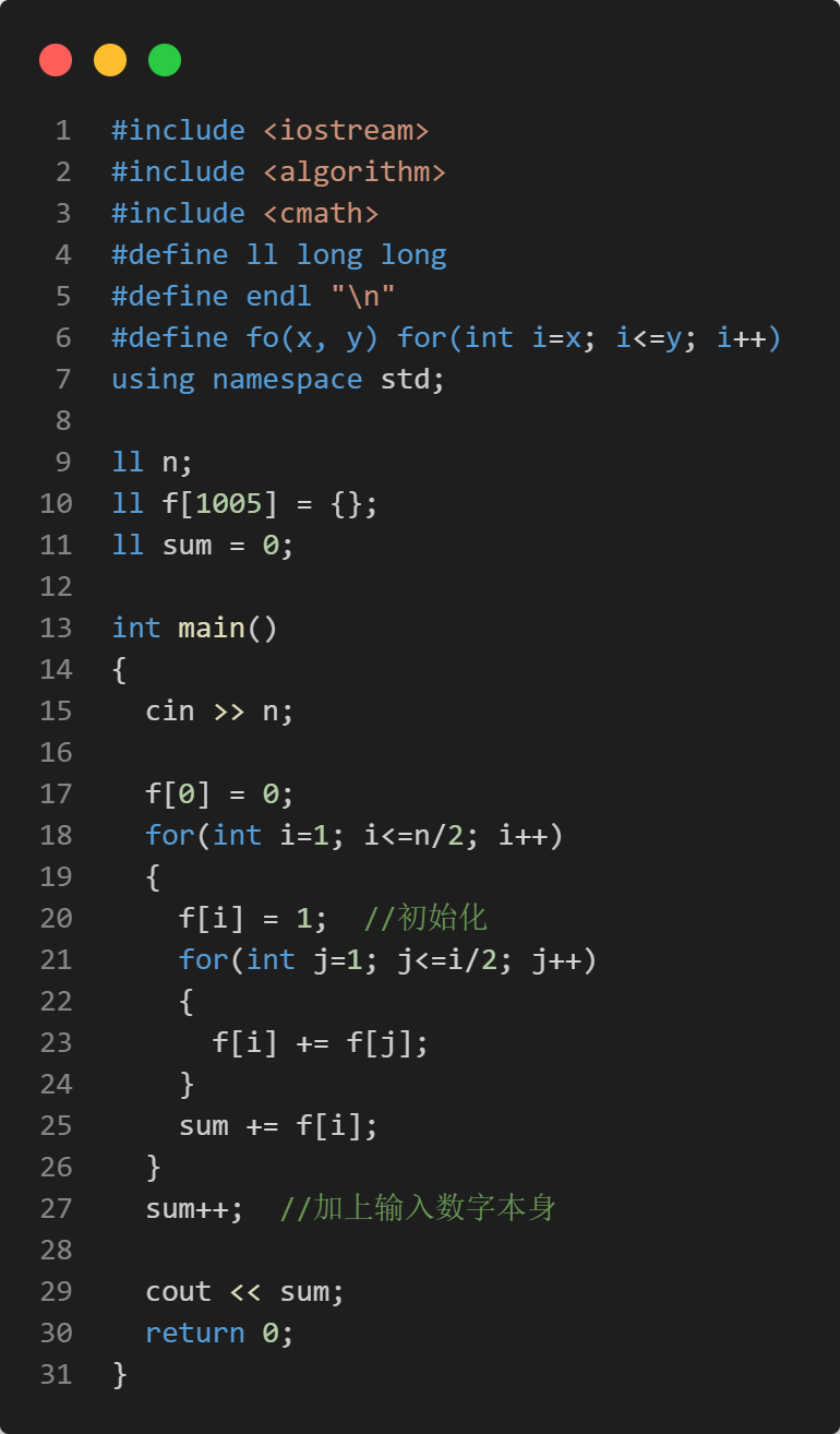 其实不难发现,本题存在明显的重叠子问题特征。不妨设当原数为 i 时,一共可产生 f(i) 个合法的数。以 n=6 为例,求解 f(6) 需要依赖子状态 f(1), f(2), f(3)。然而在求解 f(2) 和 f(3) 的过程中,会再次发起对 f(1) 的递归调用,因此可以得到状态转移方程 f(i) = f(i) + f(1) + f(2) + ··· + f(i/2)