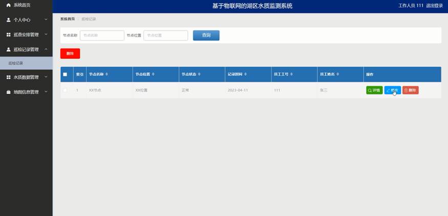 工作人员点击巡检记录管理。在巡检记录页面输入节点名称和节点位置进行查询或删除巡检记录列表,并根据需要对巡检记录详细信息进行详情、修改或删除操作。如图5-12所示: