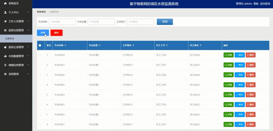 系统核心功能包括个人中心、工作人员管理、巡查安排管理、巡检记录管理、水质数据管理、地图信息管理、系统管理等。支持工作人员注册登录,维护个人信息,执行巡查任务,记录巡检节点名称、位置、状态、内容、时间等信息。水质数据管理涵盖流域、名称、监测时间、水质类别、酸碱度、浊度、水温、站点情况等关键指标;巡查安排管理可制定节点名称、位置、工作班次、巡检路线、巡查内容等计划。管理员可全面管理工作人员信息、巡查安排、巡检记录、水质数据、地图信息,维护系统配置,通过看板实现水质数据的可视化分析与管理。这些功能全面覆盖湖区水质监测的计划制定、数据采集、记录分析、可视化管理全流程,实现了监测工作的智能化、规范化与高效化,提升了水质监测的精准度与时效性。