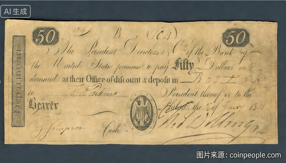 ▼图:第一合众国银行于1801年发行的银行券,面值50美元,
