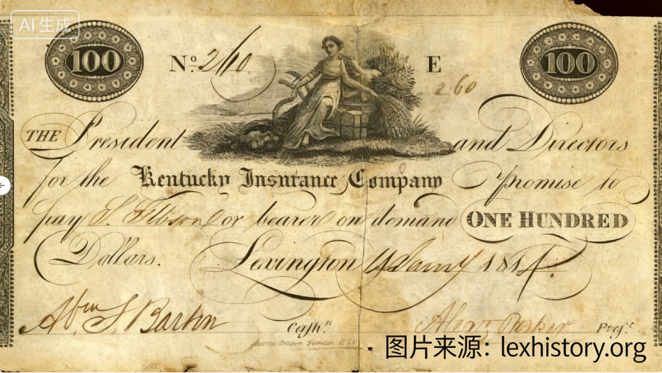 ▼图:肯塔基保险公司(Kentucky Insurance Company)于1814年发行的100美元票据,当时充当纸币流通,