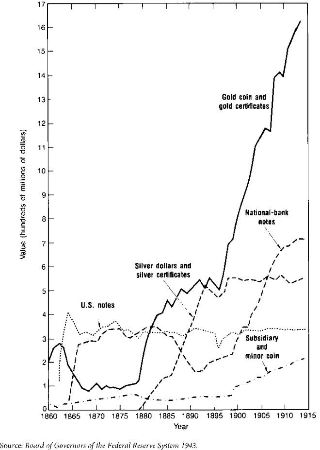 ▼图:1860-1915年美国货币流通中不同类型货币构成及价值,包括金币和黄金券、银币和白银券、绿钞、国民银行券、辅助铸币,图片来源:History of the American Economy, Tenth Edition。