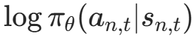 :第n回合t步,策略选择动作an,t的对数概率(代码中log_prob);