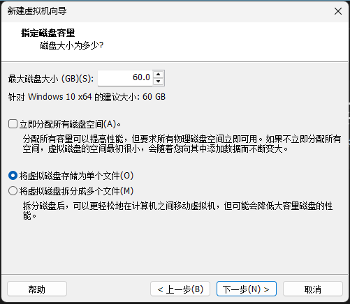 14.此界面可以选择磁盘大小,是否立即分配大小(不选的话,可以动态分配大小,和EXSI里的精简置备Thin一样,另外如勾选就如Thick,这样就会一下子分配60g空间给虚拟机磁盘,动态分配磁盘大小比较合理,我们不是服务器,不用考虑磁盘不够);下面选择"将虚拟磁盘存储为单个文件",原因界面上已经说了,我们需要磁盘性能,所以选上面。最后点击下一步: