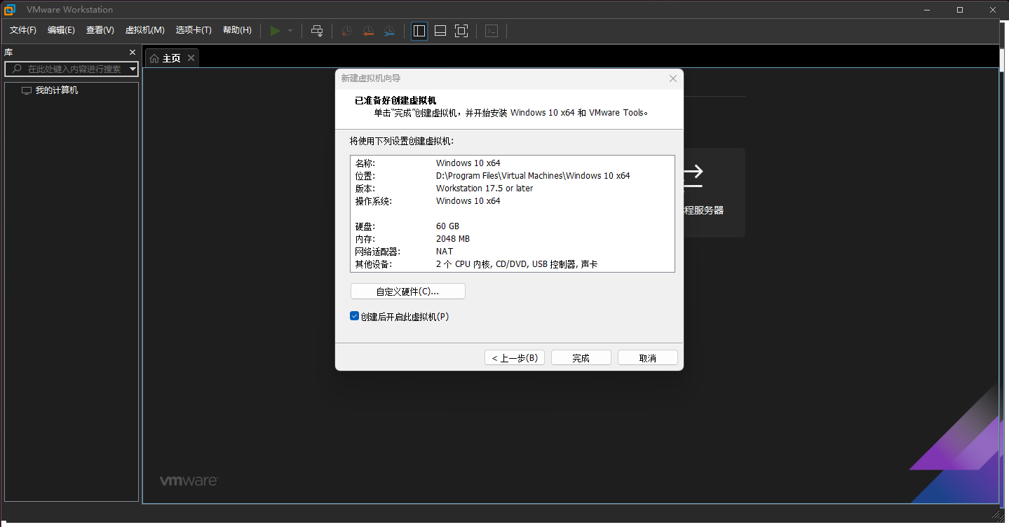 16.确认上面的配置无误后,点击下面的完成,如果上面的步骤有问题,你也可以点击此界面的"自定义硬件"重新修改或返回上面的步骤修改: